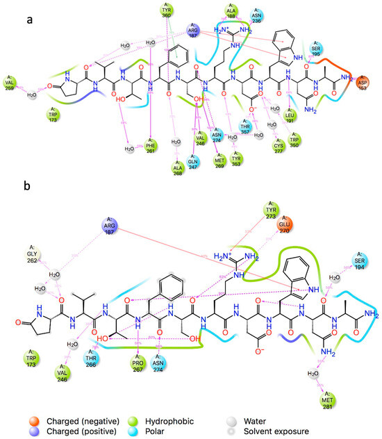 The simulation interaction diagram (SID) gives details of which ligand atoms interact with the receptor. In Figure 7 the interactions between Aedae-ACP and Aedae-ACPR are colour-coded such that H-bonding is depicted in purple, while π-cation interactions are shown in red. For the duration of the simulation, contacts between the ligand and receptor are formed and broken. This is recorded as a % of the simulation time. Only interactions that persist for more than 30% of the simulation are shown. The surface of the receptor is shown as a solid line, again colour coded, polar, hydrophobic, etc., according to the nature of the receptor residues. The active model (Figure 7a) has many interactions with the central residues of the ligand. The serine OH, H-bonds to Gln247, Met269, and Val246 for the entire simulation. The SID of the active model has a number of water molecules in the binding site, which Yuan et al. [64] have postulated are essential for receptor activation. These water molecules bridge between the ligand and the receptor. Interestingly, Trp8 of Aedae-ACP, which is postulated to be essential for binding, interacts with Arg187 in both ACP receptor models. The inactive model (Figure 7b) does not have as many interactions between the ligand and receptor but does have several internal H-bonds, which help to maintain the conformation of the ligand.