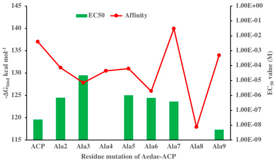 Free energy of binding and EC50 values for a series of alanine mutations of Aedae-ACP binding to Aedae-ACPR.