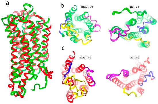 Aedae-AKHR: (a) Overlay of two models, inactive-green, active-red; (b) Top view showing extracellular loops blue = ECL1, yellow = ECL2, and purple = ECL3; and (c) Bottom view showing intracellular loops. Blue = ICL1, yellow = ICL2, plum = ICL3. For clarity, the clipping plan has been set so that only to top or bottom half of the receptor is shown.