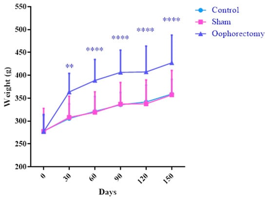 After performing the oophorectomy surgery, the animals exhibited a significant and marked increase in weight, particularly 30 days after the procedure (Figure 1). This characteristic response of oophorectomized rats, as described in the literature, confirms the success of the surgery and the establishment of the disease [50,51,52]. After 90 days post-surgery, the animals’ weight reached a plateau, with minimal variation thereafter, observed in both oophorectomized animals and surgical control animals (Sham).