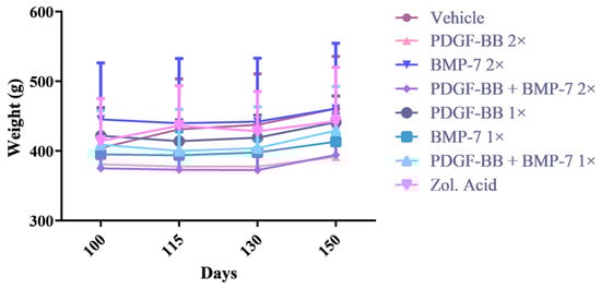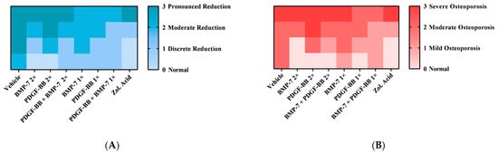 Pountos et al. (2010) demonstrated that BMP-7 and PDGF-BB can increase mesenchymal stem cell proliferation and promote osteogenic differentiation when applied separately, fostering bone regeneration in in vitro models [33]. Therefore, we hypothesized that co-treatment with these two proteins could promote tissue recovery in an in vivo osteoporosis model, potentially leading to disease regression or attenuation.