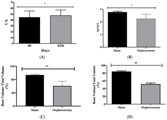 Oophorectomy induces osteoporosis after 100 days of surgery. (A): Alkaline phosphatase (ALP) concentration in animal serum on days 0 (D0) and 100 (D100) after oophorectomy surgery. U/L= Units per liter. Paired t-test, *: p < 0.05. N.: 32. (B): X-Ray analysis. On the 100th day after surgery (D100), a significant reduction in the bone mineral density of the femoral neck was observed in the oophorectomized animals, when compared to the Sham group. Unpaired t-test, *: p < 0.05. N. Oophorectomy: 32, N. Sham: 4. (C): Comparison of the bone volume fraction (BV/TV) of the trabecular region between animals in the Sham and Oophorectomy group, expressed as a percentage. Unpaired t-test, **: p < 0.01. N.: 4. (D): Comparison of the bone volume fraction (BV/TV) of the cortical region between the animals in the Sham and Oophorectomy groups, expressed as a percentage. Unpaired t-test, **: p < 0.01. N.: 4. N.: number of animals/group.