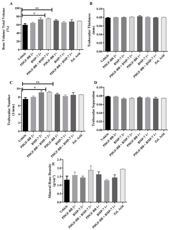 Upon evaluating the effects of different treatments, we found that the fraction of bone volume in the groups treated with BMP-7 2×/week and PDGF-BB + BMP-7 2×/week showed a significant increase, corresponding to 13% and 15%, respectively (Figure 4A). Treatment with BMP-7 2×/week and PDGF-BB + BMP-7 2×/week resulted in a significant increase (p < 0.05) in the number of trabeculae (Figure 4C), equivalent to 21% and 23%, respectively. When considering the BMD of treated animals relative to the Vehicle group, it can be noted that the treatments with PDGF-BB + BMP-7 2×/week and zoledronic acid showed a tendency to increase the animals’ BMD, although no statistical significance was found (Figure 4E).