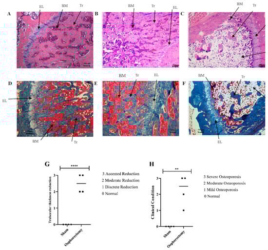 Histological data indicating the development of osteoporosis in oophorectomized animals. (A): Control stained with HE; (B): Sham stained with HE; (C): Oophorectomy stained with HE; (D): Control stained with Masson’s Trichrome; (E): Sham stained with Masson’s Trichrome; (F): Oophorectomy stained with Masson’s Trichrome; (G): Score of the clinical status of controls referring to histopathological analysis; **: p < 0.01, ****: p < 0.001 (H): Controls trabecular reduction score for histopathological analysis. N.: 4. Scale bar: 100 µm. Ad: Adipocytes; BM: Bone marrow; Tr: Trabeculae; EL: Epiphyseal line; N.: number of animals/group; Circle: Sham group animal; Square: Oophorectomy animal group; Line: Group median. Each square represents one animal, the double square symbol corresponds to two animals.