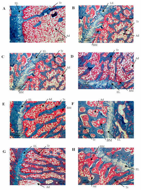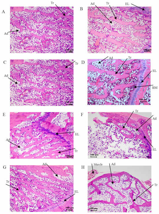 Histological slides stained with HE comparing the different groups analyzed. (A): Vehicle; (B): Zoledronic acid; (C): PDGF-BB 2×/week; (D): PDGF-BB 1×/week; (E): BMP-7 2×/week (F): BMP-7 1×/week; (G): PDGF-BB + BMP-7 2×/week (H): PDGF-BB + BMP-7 1×/week. Scale bar: 100 µm. In pink/reddish are the cytoplasm and collagen fibers, in purple were stained the cell nuclei. Ad: Adipocytes; BM: Bone marrow; Tr: Trabeculae; EL: Epiphyseal line.