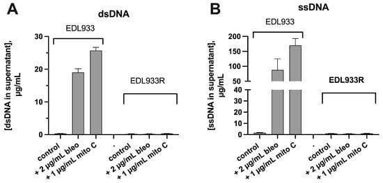 Our previous report on DNA release was incomplete in that we assumed that the nucleic acid being released in response to SOS inducers was all double-stranded DNA (dsDNA). Indeed, dsDNA is released, but ssDNA is released in greater amounts. As shown in Table 2, ssDNA exceeded dsDNA by a factor of 4.7 (average of 5 species and strains; see also Figure 6 and Figure 6). As stated above in Results, the total concentration of SOS-induced nucleic acids released in the culture supernatants exceeded 100 µg/mL, at least in the most robust responders (E. coli EDL933 and E. cloacae). In addition to the release of nucleic acids, large amounts of protein were also released into the supernatant medium (Figure 6D), which may be important since protein and DNA are present together in biofilms (Figure 4B–F).