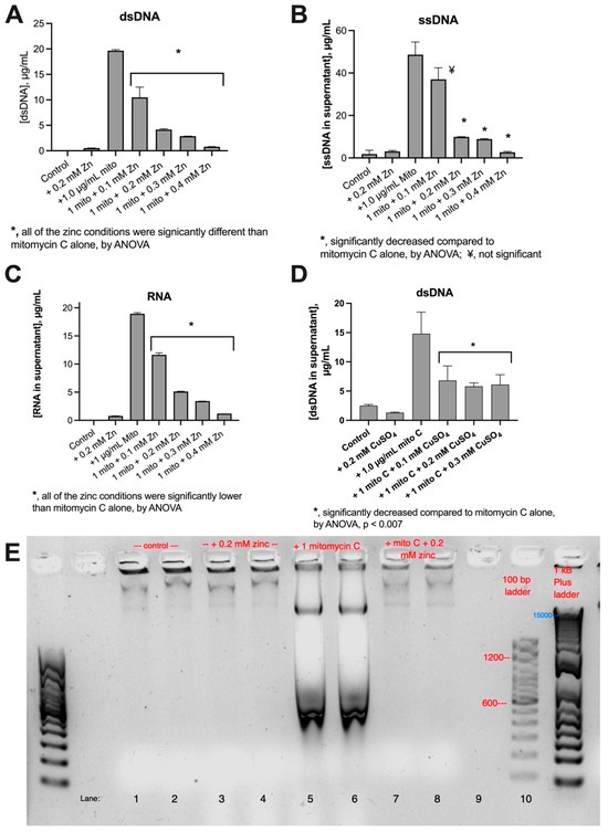 Divalent transition metals as inhibitors of SOS-induced DNA release in E_clo_Niagara. Panel (A): effect of zinc acetate on dsDNA release. Panel (B): effect of zinc on ssDNA release. Panel (C): effect of zinc on RNA release. Panel (D): effect of CuSO4 on dsDNA release. Copper sulfate also inhibited ssDNA release. Panel (E): DNA agarose gel, stained with SybrSafe dye, showing differential effects of zinc acetate on lower vs. higher molecular weight dsDNA bands released in response to mitomycin C. Image was inverted to display dark bands on a light background. DNA released by mitomycin C shows a characteristic W-shaped artifact (Lanes 5 and 6).
