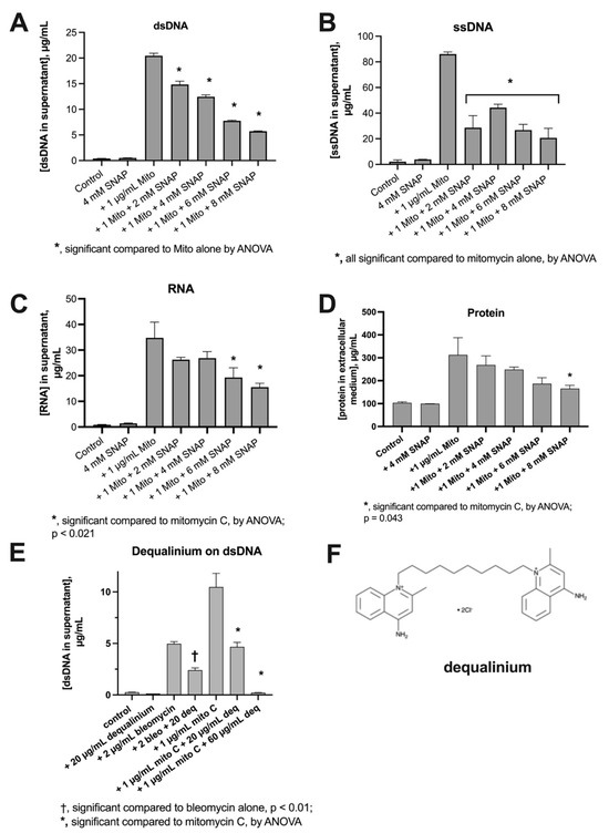 Effect of nitric oxide donors and dequalinium on SOS-induced DNA release in E_clo_Niagara. Panel (A): effect of S-nitroso-acetyl-penicillamine (SNAP), an NO donor, on release of dsDNA. Panel (B): effect of SNAP on ssDNA release. Panel (C): effect of SNAP on RNA release. Panel (D): effect of SNAP on protein release. Panel (E): effect of dequalinium, an inhibitor of the bacterial generalized stress response, on release of dsDNA. Panel (F): chemical structure of dequalinium, a quaternary ammonium compound. In addition to demonstrating the effects of SNAP, (A–C), highlights the massive amount of mitomycin-induced nucleic acid released from E_clo_Niagara in these experiments. The combined concentrations of nucleic acids (dsDNA + ssDNA + RNA) released into the extracellular medium were quite large, totaling 141 µg/mL, after a mere 2.5 h of exposure to the drug.