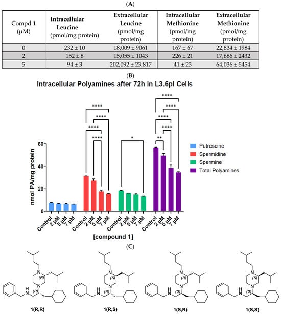 (A) Table showing the intra- and extra-cellular concentration of leucine and methionine in L3.6pl human pancreatic cancer cells after 72 h of incubation with increasing concentrations of compound 1 (RS isomer). LC-MS was used to measure each amino acid analyte. Extracellular levels were obtained from supernatant collection and intracellular levels were obtained after washing steps and lysis of the remaining cells. The data were normalized by dividing by the mg protein. Details of this method are described in Massaro et al. [10]. At least 3 independent experiments were performed, and samples were run in duplicate. Data are presented as mean ± SEM. (B) Dose-dependent polyamine depletion in the presence of 1 in L3.6pl pancreatic cancer cells as shown previously [10]. L3.6pl cells were dosed with increasing concentrations of compound 1 (RS isomer) and cells were incubated for 72 h at 37 °C. The untreated control was run in parallel and polyamine levels were determined in duplicate via N-dansylation and analysis by HPLC [17]. The data were averaged and reported as nmol polyamine (PA)/mg protein. * (p value ≤ 0.05), ** (p ≤ 0.01), **** (p ≤ 0.0001). (C) The structures of the four possible stereoisomers of compound 1.