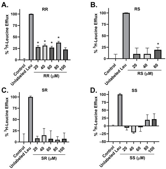 Dose-dependent efflux assay demonstrating the ability of each isomer of 1 (Panel A: RR, Panel B: RS, Panel C: SR and Panel D: SS) to directly stimulate efflux of 3H-leucine compared with 100 μM unlabeled leucine and the PBS control after 30 min. The unlabeled leucine control provided the benchmark and was always set to 100% for comparisons. Asterisks denote that the p-value is 0.05 or less.