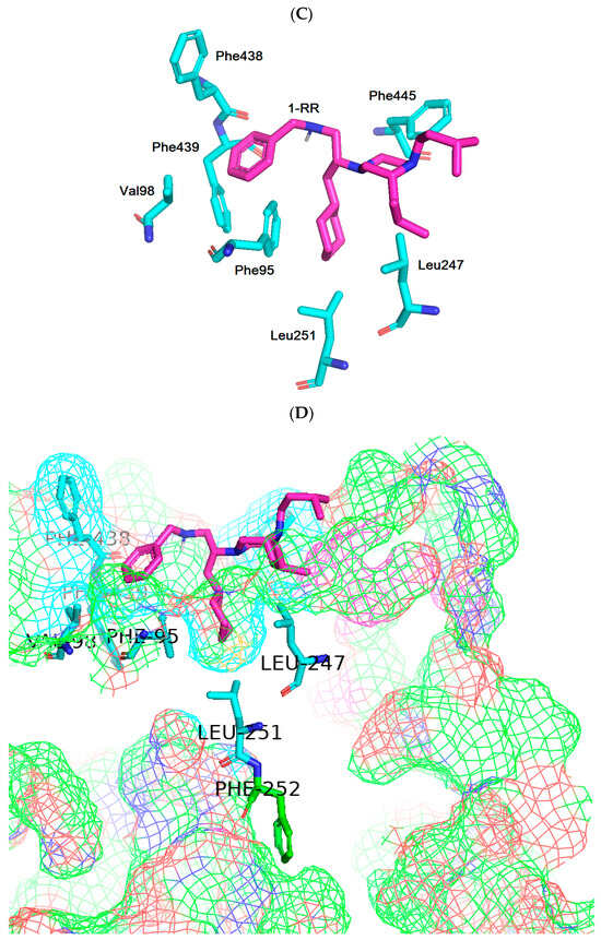 (A) LAT-1 bound to each of the four isomers of 1. The relative binding affinities of these isomers for LAT1 were all similar in silico (RR: −6.9; RS: −7.0; SR: −7.2; and SS: −7.2 kcal/mol) but each isomer also made unique contacts with the LAT1 surface beyond the cyclohexyl/pore interaction. (B) (4 panels) Zoomed-in view of each isomer of 1 docked to the LAT1 pore. We note that the SR and SS isomers do not prefer to interact with the right-side pocket of this allosteric site as shown in (B). Relevant LAT1 residues interacting with 1 (RR) (C) and the proximity of this putative binding site to the gatekeeper Phe252 (D). The multi-colored wireframe model shows the relevant LAT1 protein scaffold with key nearby residues highlighted in teal color and the gatekeeper residue Phe-252 shown in bright green.