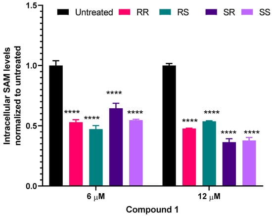 Graphical representation of the intracellular levels of SAM detected by HPLC in cells treated with either 6 µM or 12 µM of each diastereomer. The intracellular SAM levels are shown normalized to the respective untreated control from each experiment wherein each treatment was performed in triplicate. The data are representative of the mean +/− SD of three independent experiments (**** p ≤ 0.0001 vs. the untreated control).