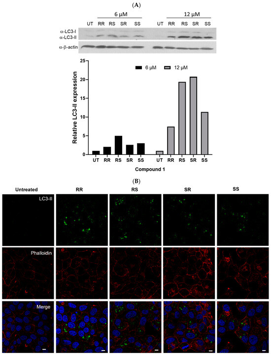 (A) Western blot showing induction and quantification of LC3-II protein in L3.6pl cells treated with each of the four isomers at either 6 µM or 12 µM of compound 1. β-actin was used as a loading control. The quantification graph shows the relative expression of the LC3-II protein normalized to untreated in each group. Experiments were performed five times as single experiments and a representative image is shown in (A). (B) Representative confocal images showing LC3-II-positive puncta in cells treated with each of the four isomers at 6 µM. LC3-II protein is shown in green, phalloidin (actin stain) in red, and DAPI-stained nuclei are shown in blue. Scale bars shown in white represent 5 µm and all panels were taken at the same magnification. Original Blot Images can be found in the Supplementary Materials.