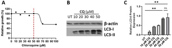 Chloroquine (CQ) mediated growth inhibition and protein studies showing a selection of the 50 μM dose. (A) Chloroquine induced growth inhibition in L3.6pl cells after 24 h of incubation. (B,C) Representative Western blot image showing induction and quantification of LC3-II protein in L3.6pl cells treated with different CQ doses. β-actin was used as a protein loading control. At least 3 independent experiments were performed. Data are presented as mean ± SEM. ** p ≤ 0.01. ns = not significant. Original Blot Images can be found in the Supplementary Materials.