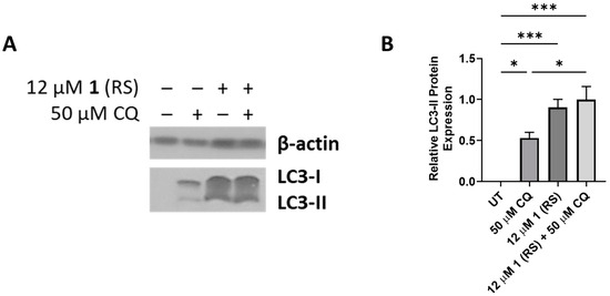 Next, we investigated how LC3-II expression changes in the presence and absence of CQ (50 µM) and 1 (Figure 7). The (RS) isomer of 1 at 12 μM was selected for this assay because it resulted in significant induction of LC3-II in preliminary experiments. As shown in Figure 7, both chloroquine and 1 induced LC3-II expression as expected. However, the combination of chloroquine and 1 gave a statistically significant higher expression of LC3-II when compared with CQ alone (p-value ≤ 0.05) and untreated (p-value ≤ 0.001). This result demonstrated that 1 can induce LC3-II production even when the lysosomal processing of LC3-II is disrupted by CQ. In summary, the CQ assay results are consistent with compound 1 inducing LC3-II expression/autophagy by a non-lysosomotropic mechanism.