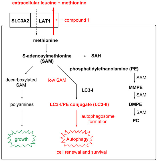 These experiments allow us now to propose a mechanism of action for 1. Our data support the mechanism where the methionine efflux induced by 1 lowers intracellular methionine, SAM, and polyamine levels and induces autophagy via the SAM-driven lipid pathway suggested by Ye et al. (Figure 8) [29]. Our work suggests that as methionine and SAM pools become limited, the scarcity of available methyl sources shunts PE pools toward lipidation of cytosolic LC3-I to form the autophagosome lipoprotein LC3-II (a PE/LC3-I conjugate). LC3-II is then recruited to the autophagosomal membranes, which, in turn, enables the autophagic recycling of proteins. This reshuffling of methylated and non-methylated lipids presumably occurs to ultimately reclaim methionine (Figure 8) and facilitate cell survival under conditions of MR.