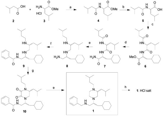 The formation of the respective diketopiperazine 10 was accomplished in 75% yield by reacting the respective isomer of 9 with five equivalents of oxalyl diimidazole at rt [21]. The final reduction of 10 with BH3-THF afforded each final stereoisomer of 1 as a single compound in typically 43–63% yield. Alternatively, these compounds could be readily converted to their respective HCl salts for long-term storage. Conversion to the corresponding hydrochloride salt was performed in 4 M HCl/EtOH to give the final product 1. In summary, the selection of either the R- or S-isomers of 3 or cyclohexylalanine methyl ester allowed for the generation of each isomer of 1 (RR, RS, SR, or SS).