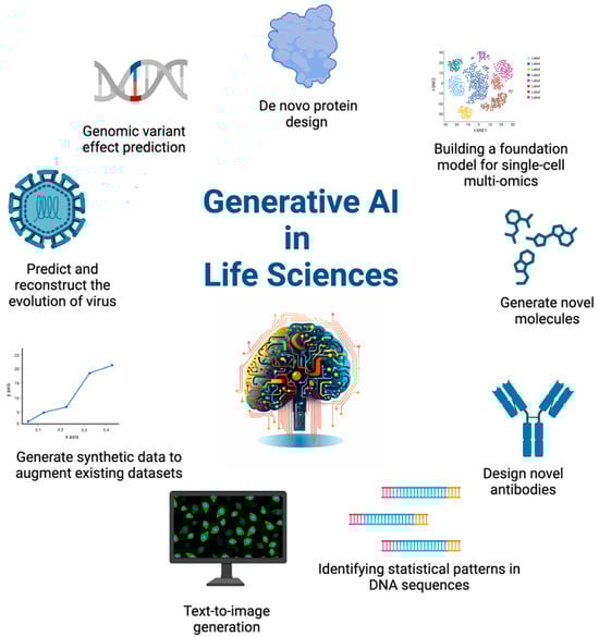 Generative AI has emerged as a transformative force in the life sciences sector (Figure 6), powering innovative research, optimizing workflows, and providing new insights. Its applications are extensive and varied: We previously discussed de novo design of proteins [48,49], the creation of novel antibodies [50], and the building of comprehensive models for single-cell multi-omics [51], which can provide a deeper understanding of the cellular heterogeneity in tumors and inform the development of personalized cancer treatments.