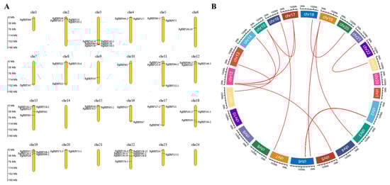 The AP2/ERF transcription factor family has been extensively researched in a variety of plants, such as Arabidopsis [], Fagopyum tataricum [], Hordeum vulgare [] and Rhododendron []. We targeted the PgERF gene to chromosome 24 pairs in Panax ginseng, and 11 duplication events were identified in the 24 pairs of ginseng chromosomes (Figure 1).