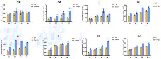 Effect of ethylene induction on eight ginsenosides content in ginseng hairy roots. The X-axis indicates the ethylene inducers were added to the ginseng hairy roots at four different times. The Y-axis indicated the ginsenoside content (mg/g). “*” indicate significant difference at p ≤ 0.05, “**” indicate significant difference at p ≤ 0.01, “***” indicate significant difference at p ≤ 0.001, and “****” indicate significant difference at p ≤ 0.0001, respectively.