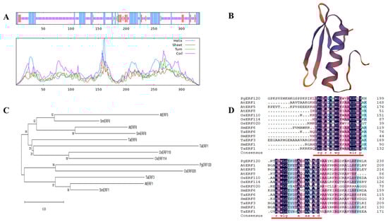 Characterization of the PgERF120 gene. (A) Secondary structure analysis of the ginseng PgERF120 protein. Blue, green, purple and red lines represent α-helix, β-turn, random coil and extended chain. (B) Tertiary structure of PgERF120 protein. (C) Evolutionary relationships between PgERF120 and some ERF gene family members of the remaining species. (D) Comparison of amino acid sequences of the PgERF with protein sequences of other species. The red line marks the ERF structural domain.