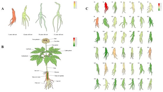 Heatmaps analysis spatiotemporal expression patterns of the PgERF120 gene in ginseng. (A) The PgERF120 gene expressed in the 4 different aged stages (5, 12, 18, 25 years-old) of ginseng roots. (B) The PgERF120 gene expressed in the 14 different tissues of 4-year-old ginseng. (C) The PgERF120 gene expressed in the 42 farm cultivars of 4-year-old ginseng roots.