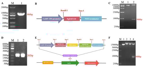 With cDNA as a template, the PgERF120 gene was successfully cloned, and the fragment length was 906 bp (Figure 6A). The recombinant plasmid pBI121-PgERF120 was double-digested with BamHI and SmaI, and the length of the cut bands matched with the target fragment, so the overexpression vector was successfully constructed (Figure 6B,C). The forward- and reverse-interfering fragments of the target gene were successfully obtained with a length of 202 bp (Figure 6D). At the same time, it was verified by double-enzyme digestion that the cut fragment matched the actual fragment, and the interference vector of the target gene was constructed successfully (Figure 6E,F).