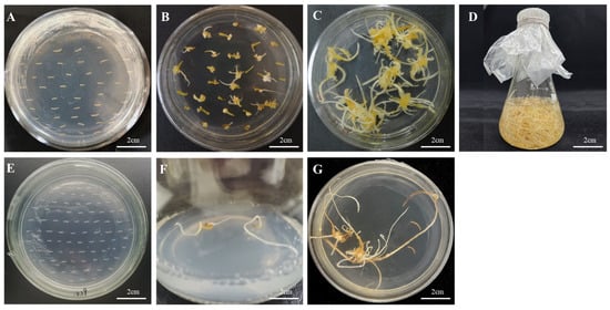 Induction of hairy roots by PgERF120 gene overexpression vector and interference vector transformation. (A) Co-culture of overexpression vector transformed adventitious roots. (B) Induction of overexpression vector transformed hairy roots. (C) Culture of overexpression vector transformed hairy roots. (D) Expansion of overexpression vector transformed hairy roots. (E) Interference vector transformed adventitious roots. (F) Interference vector transformed hairy roots induction. (G) Interference vector transformed hairy roots culture.