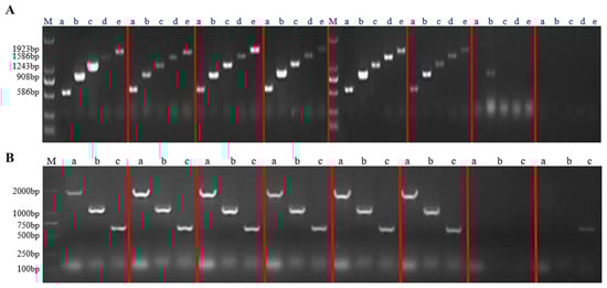 The PgERF120 gene overexpression and interference plant assays. (A) Detection of overexpression of hairy root positive plants. M: DL2000 Maker, a–e: hairy root PCR assay. (B) Detection of RNA interference in hairy root positive plants. M: DL2000 Maker, a–c: hairy root PCR assay.