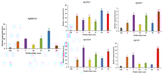 Positive hairy root asexual lines overexpressing PgERF120 were labelled 6, 7, 16, 27, 28 and 29, and the relative expression levels of PgERF120 in overexpression-positive hairy roots were measured using wild-type hairy roots as a control (Figure 9). The relative expression levels of the PgERF120 gene were all increased in the positive hairy root asexual lines compared to the wild-type hairy roots, with the smallest change in expression in hairy root asexual line 29, which was 2.99 times that of the control, and the most significant change in expression in hairy root asexual line 28, which was 18.16 times that of the control. This indicates that hairy root asexual lines overexpressing the PgERF120 gene were successfully obtained.