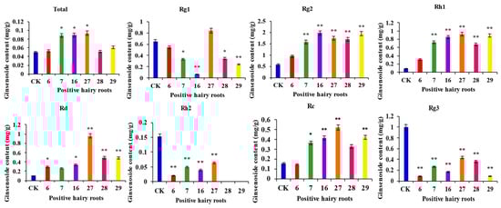 Determination of the ginsenoside content of PgERF120-positive hairy root asexual lines and wild-type hairy roots (Figure 10). The content of the four monosaponins Rc, Rd, Rh1 and Rg2 was significantly increased, and the content of monosaponins Rg1, Rh2 and Rg3 was significantly reduced in the transgenic hairy roots overexpressing the PgERF120 gene. The total ginsenoside content was significantly higher in the three transgenic hairy root asexual lines (Nos. 7, 16 and 27) overexpressing the PgERF120 gene than in the control. These results indicated that the PgERF120 gene could regulate the biosynthesis of ginsenosides.