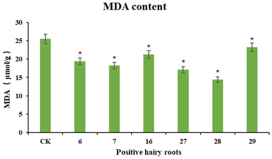 MDA content in cold-stressed ginseng hairy roots. The X-axis indicates the overexpression-positive ginseng hairy roots lineage. The Y-axis indicated the MDA content (μmol/g). “*” indicate significant difference at p ≤ 0.05, respectively.