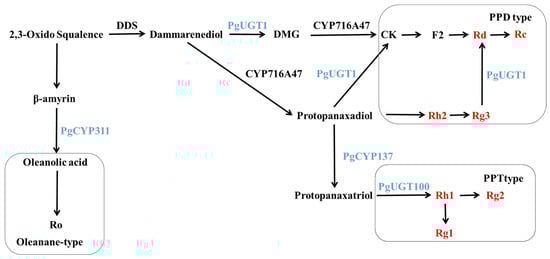 Dammarendiol synthase (DDS) has been shown to cyclize 2,3-oxo-squalene to produce dammarendiol []. In 2011, Han [] co-expressed PgDDS and PgCYP716A47 in yeast and found that protopanaxadiol-type sapogenins (PPDs) could be produced without the addition of dammarendiol and verified that CYP716A47 could catalyze the production of PPD from dammarendiol by in vitro enzymatic activity assays. In 2019, Gwak [] co-transformed PgDDS, PgCYP716A47 and PgCYP716A53v2 (PgCYP137) into tobacco and produced protopanaxatriol-type sapogenins (PPT) in transgenic tobacco, indicating that CYP716A53v2 can catalyze PPD to produce PPT. In 2014, Yan [] heterologously expressed the UGTPg1 (PgUGT1) gene in yeast and found that the UGTPg1-encoded protein could catalyze the production of rare ginsenoside CK from PPD as a substrate, as well as another novel compound, 20S-O-β-(D-glucosyl)-dammarenediol II (DMG). UGTPg1 catalyzed the production of DMG from dammarenediol, which, in turn, was catalyzed by CYP716A47 to produce CK. When PPD and dammarenediol were present together, dammarenediol was preferentially selected as the substrate to exert catalytic activity; this study also verified the catalytic activity of UGTPg1 in converting Rg3 to Rd. In 2015, Wei [] demonstrated that the protein encoding the UGTPg100 (PgUGT100) gene catalyzes the production of Rh1 from PPT by specifically glycosylating the C6-OH of PPT.