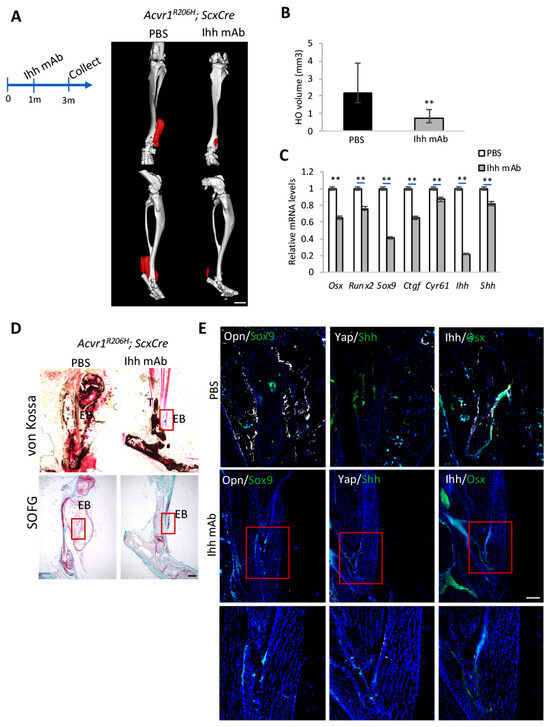 To determine whether increased Ihh is required for HO and its expansion, Ihh mAb [29] was applied, via an intraperitoneal (IP) injection, to 1-month-old Acvr1R206H; ScxCre mice when no ectopic bone was detected. The tissue was collected from 3-month-old mice, followed by micro-CT scanning and qRT-PCR analysis (Figure 2A–C). Measurements of their ectopic bone volume based on micro-CT images confirmed that ectopic bone was dramatically reduced by the Ihh mAb treatment. The expression of Sox9, Osx, Runx2, and the Yap target genes Ctgf and Cyr61 (Figure 2C) was also reduced, indicating that chondrocyte and osteoblast differentiation are halted by the Ihh mAb treatment. It is interesting to find that Yap activities were also reduced by Ihh mAb. Previous studies by our lab showed the Yap-Shh feedback loop promoting ectopic bone expansion in both genetic and injury-induced HO [28], based on qRT-PCR data. Shh levels were also reduced due to the Yap target gene decreases after the Ihh mAb treatment (Figure 2C). Von Kossa and SOFG staining showed much-reduced ectopic bone lesions and chondrogenesis after the Ihh mAb treatment (Figure 2D). Fluorescence images revealed the colocalization of Ihh+/Osx+ and Yap+/Shh+ during the chondrogenic process and ectopic bone formation. After two months of the Ihh mAb treatment, cells expressing Opn, Sox9, and Yap were much decreased (Figure 2E).