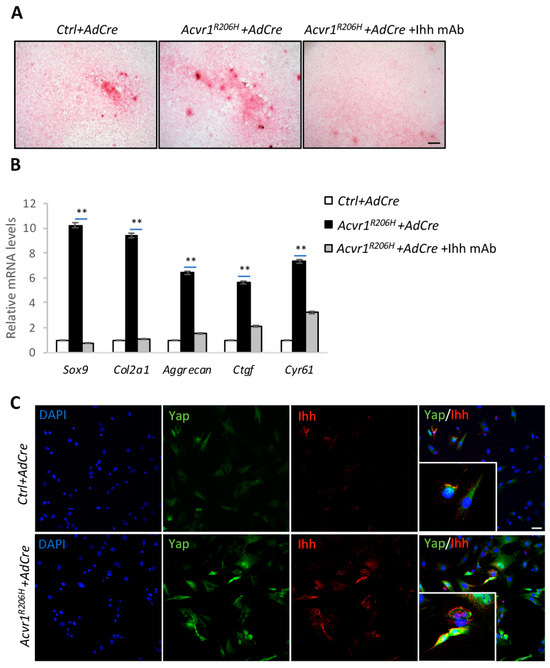 To test Yap and Ihh expression in vitro, tenocytes were isolated from 1-month-old Acvr1FlExR206 mice. The tenocytes were cultured for seven days before Adenovirus Cre (AdCre) infection to induce the expression of Acvr1R206H. Safranin O staining showed much stronger chondrocyte differentiation in the Acvr1R206H group compared to the control (Figure 4A). The expression of chondrocytes’ markers, Sox9, Col2a1, and Aggrecan, were much increased. The expression of Ihh and the Yap target genes Ctgf and Cyr61 were also increased (Figure 4B). Additionally, the Ihh mAb treatment blocked chondrogenesis in Acvr1R206H tenocytes, as well as the chondrocytes’ markers (Figure 4A,B). Interestingly, Ihh mAb also decreased the Yap target genes’ expression, suggesting that Ihh could also regulate the Yap activities in tenocytes (Figure 4B). Fluorescence images of the cultured tenocytes showed the nuclear localization of Yap and increased Ihh, indicating the activation of Yap in Acvr1R206H tenocytes (Figure 4C). These data confirmed the upregulation and colocalization of Yap and Ihh, suggesting the direct regulation of Yap and Ihh in FOP models.
