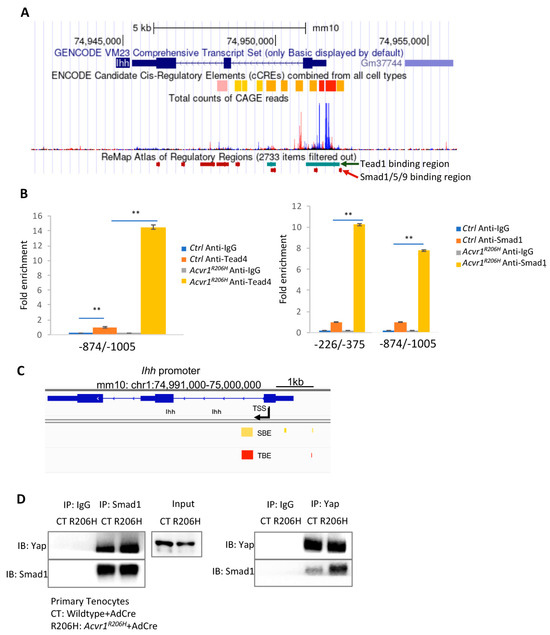 Ihh is a direct target of the Yap transcription factor. (A) The candidate cCREs and the ReMap atlas of regulator regions analyzed from the UCSC genome browser. (B) ChIP-qPCR analysis of the Yap/Tead4 and Smad1 binding sites on the Ihh promoter. (mean ± SD; N = 3 biological replicates.) ** p < 0.01, one-way ANOVA followed by Tukey’s multiple comparisons test. (C) TBE and SBE analysis of the Ihh promoter. Red, TBE; yellow, SBE. (D) Co-IP analysis in control and Acvr1R206H tenocytes.
