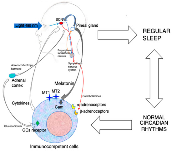 Blue light constitutes the major environmental cue regulating MLT synthesis in the pineal gland by inducing the nocturnal activation of preganglionic sympathetic neurons. MLT produced during the darkness hours is released into the blood and synchronizes the central biological clock of the organism, i.e., the SCN, with the photoperiod. In turn, the SCN drives the circadian oscillation of the sympathetic nervous system, which may influence immunocompetent cells via the adrenergic activation of α-and β-adrenoceptors. The SCN rhythm also induces the paraventricular nucleus to release corticotropin-releasing hormone, which, in turn, stimulates adrenocorticotropic hormone production by the anterior hypophysis. This final step stimulates the production of glucocorticoids(GCs) by the adrenal cortex. All together, these mechanisms influence the circulation, migration and functions of immunocompetent cells. In addition, a robust circadian machinery is associated with regular sleep, with positive effect on immunity. Last but not least, circulating MLT may act directly on MT1 and MT2 expressed on immunocompetent cells, as well as on calmodulin (CAM), and modulate the expression of cell adhesion molecules, cytokine production and cell proliferation. The circadian administration of exogenous MLT using amounts that do not oversaturate its receptors may reinforce both the indirect and direct immunoenhancing effects of MLT.