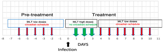 On the basis of the available evidence of the possible therapeutic actions of MLT in combating infections, various treatments schedules have been proposed. The scheme represents different experimental possibilities for investigating the therapeutic effects of MLT. The effects of pretreatment and treatment might be evaluated either separately or in combination, and within the treatment protocol, we could evaluate separately the effects of the non-circadian high doses vs. those of the circadian low doses and so on. Hopefully, various doses of MLT will be investigated, with low doses possibly ranging from 10 μg to 1000 μg/kg administered in a circadian fashion in the evening and high doses ranging from 3 mg to 50 mg/kg administered in the morning. Of course, all relevant control groups should be included.