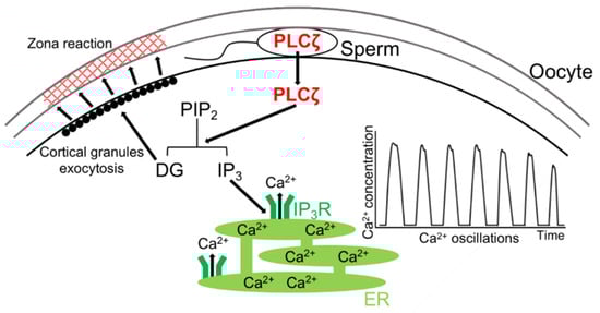 Mechanism of rise(s) in intracellular Ca2+ level via PLCζ during mammalian fertilization. After the sperm–oocyte fusion, PLCζ is released from the sperm into the oocyte. PLCζ hydrolyzes phosphatidylinositol 4,5-bisphosphate (PIP2) to inositol trisphosphate (IP3) and diacylglycerol (DG). DG induces the exocytosis of cortical granules, results in the zona reaction, and IP3 binds to the IP3 receptor (IP3R), which leads to the release of Ca2+ from the endoplasmic reticulum (ER).
