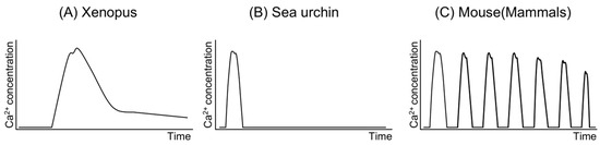 Rises in Ca2+ concentration within the oocyte are observed during fertilization across all species investigated to date [17]. These Ca2+ increases occur as a single wave in some species, such as Xenopus and sea urchins [18,19,20,21], while in others, they manifest as repetitive waves [22,23,24] (Figure 2). In mammals like humans and mice, oocytes exhibit repetitive Ca2+ increases, known as “Ca2+ oscillations”, immediately following sperm–oocyte fusion [22,25,26,27], with variations in duration, amplitude, and frequency observed among species [26]. In mouse oocytes, the typical Ca2+ concentration is approximately 100 nM, peaking at just under 1000 nM, with each increase lasting approximately 0.5 min [25,28]. Ca2+ oscillations persist for about 4–5 h, ceasing around pronuclear formation [29,30,31]. Consequently, Ca2+ oscillations are regarded as a pivotal event for oocyte activation, particularly in mammals. Numerous researchers have endeavored to elucidate the mechanisms underlying Ca2+ oscillations [32,33]. Studies have demonstrated that a reduction in the number of Ca2+ oscillations during fertilization in mice results in aberrant gene expression in blastocysts and abnormal postnatal growth of offspring following embryo transfer of the blastocyst [34]. Nevertheless, whether Ca2+ oscillations are indispensable for mammalian fertilization remains unclear.