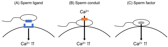 Three hypotheses have been proposed regarding the mechanism of Ca2+ oscillations in the oocyte during fertilization (Figure 3). The first hypothesis, known as the “Sperm ligand theory”, suggests that receptors on the oocyte membrane bind to ligands on the sperm, leading to an increase in Ca2+. This process is believed to involve G proteins that activate phospholipase C isoforms (PLCs) within the oocyte [39]. The second hypothesis, termed the “Sperm conduit theory”, posits that extracellular Ca2+ enters the oocyte through the sperm when the sperm membrane fuses with the oocyte membrane [19,40]. However, the success of intracytoplasmic sperm injection (ICSI) has challenged these two hypotheses, as ICSI does not involve the fusion of sperm and oocyte membranes during fertilization.