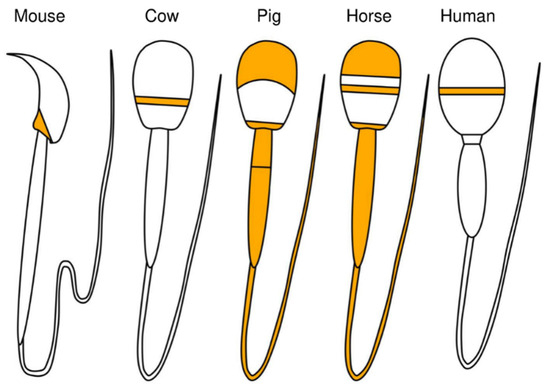 Species-dependent localization of PLCζ in mammalian spermatozoa. Orange indicates the localization of PLCζ protein.