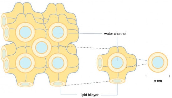 Schematic illustration of LCP. In orange, lipid bilayers are illustrated in highly convoluted membranes, where membrane proteins are embedded through hydrophobic interactions. Water channels, shown in blue, transport the precipitant. The size of the water channels can vary depending on the lipids, stoichiometry, additives, and precipitant used.