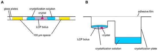 Schemes of different LCP crystallization approaches. (A) Sandwich LCP approach: the LCP bolus is covered with a crystallization solution and sandwiched between two glass plates. Spacers of 100 µm keep the glass plates apart. (B) Sitting drop LCP crystallization in a round-bottomed sitting drop crystallization plate. An LCP bolus is pipetted into the round cavity covered with crystallization solution. The crystallization solution is stored in the reservoir (rectangular cavity).