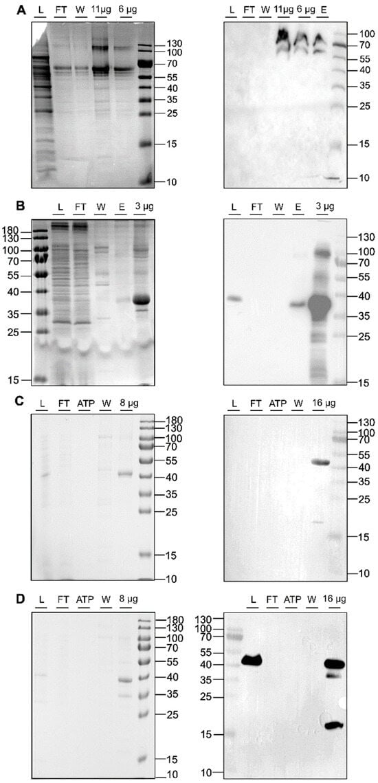 SDS-PAGE protein gels (left panel) and Western blots (right panel) of IMAC purifications for ETR21-186mT2 (A), ETR11-316 (B), ETR11-407 (C), and ETR11-157mT2 (D). The blots and gels were marked with sample load (L), flow-through (FT), ATP wash step (ATP), 50 mM imidazole wash step (W), 250 mM elution step (E), or x µg of the concentrated sample after imidazole removal. For immunoblotting, anti-GFP-HRP (Santa Cruz Biotechnology, Danvers, MA, USA) was used (A). Western blot signals in (B–D) were detected by HRP-conjugated anti-His antibody (Miltenyi Biotec B.V. & Co. KG, Bergisch-Gladbach, Germany). Colloidal Coomassie staining was used for SDS_PAGE protein gels shown on the left panel.