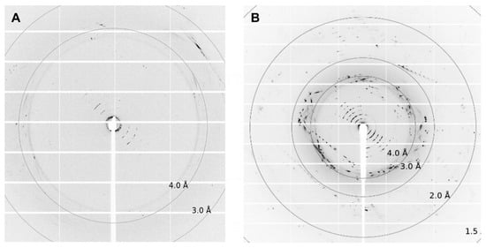 Depending on the lipid crystals obtained in our LCP screening, trials showed significant variations in size (35–200 µm) and morphology from amorphous crystals to cubes, needles, plates, and rods (Figure 5). Most of these crystals showed no diffraction on synchrotron beamlines, except for crystals from ETR11-316 and ETR21-186 mT2, which diffracted up to 4 Å and 2 Å, respectively. However, as shown in Figure 6, the overall data quality for these crystals was poor. The related diffraction pattern was rotationally blurred and showed high mosaicity, indicating disorders and poorly defined lattice packing. Peak integration and processing of the data collected for these crystals failed. Attempts to further optimize the initial crystallization conditions from the screening (0.1M CaCl2, 0.1 M Tris pH 8.5; 28% (v/v) PEG300) by varying the salt or PEG concentrations have not succeeded. As a result of high salt, crystal processing and analysis were further complicated by salt crystals forming alongside the protein crystals, which interfered with harvesting protein crystals from the LCP and caused disturbing background noise in the diffraction images (Figure 6). By contrast, only non-diffracting protein crystals were obtained with low salt.