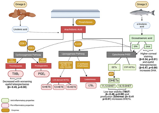 In this study, we found some relationships between DE/MGD signs, PUFAs, and their derivatives, even when considering potential confounders. Specifically, the multivariable analysis found negative correlations between tear film parameters (stability and production) and anti-inflammatory eicosanoids (11,12-DHET and 14,15-DHET), suggesting compensatory mechanisms to a pro-inflammatory state driven by tear abnormalities. Similar findings were noted when considering corneal staining and eyelid telangiectasias, as they were related to higher levels of the anti-inflammatory eicosanoid DHA.