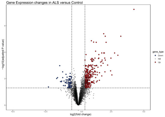 The gene expression data were analyzed using RStudio environment and specific Bioconductor packages [36]: affy (v1.78.2), oligo (v1.64.1), GEOquery (v2.68.0), limma (v3.56.2) and ggplot2 (v3.4.3). Data correction and normalization were initially performed. Subsequently, the limma package’s moderated t-test, based on the empirical parametric Bayes method, identified differentially expressed genes (DEGs) between ALS patient and control samples. The criteria for DEGs included |logFC| > 0.5 (1.4-fold change) for up-regulated genes, |logFC| < 0.5 (0.7-fold change) for down-regulated genes and a p-value < 0.05. The results were visualized using a volcano plot created with ggplot2 packages.