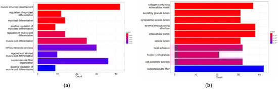 The analysis revealed that up-regulated DEGs were involved in biological processes such as muscle structure development, myoblast differentiation and regulation of myoblast differentiation, among others. In terms of the CC, DEGs were mainly enriched in collagen-containing extracellular matrix, external encapsulating structure and extracellular matrix. The molecular functions associated with these DEGs were mainly structural molecule activity, mRNA binding and extracellular matrix structural constituent.