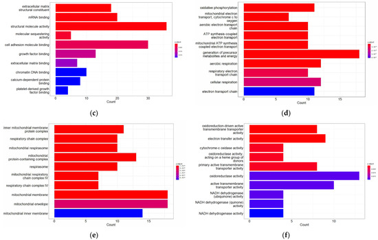 Gene Ontology (GO) function and pathway enrichment analysis of up-regulated DEGs and down-regulated DEGs. The top 10 terms for each of the GO analysis categories’ biological processes (BPs), cellular component (CC) and molecular function (MF) are presented. (a) BPs of up-regulated DEGs; (b) CC of up-regulated DEGs; (c) MF of up-regulated DEGs; (d) BPs of down-regulated DEGs; (e) CC of down-regulated DEGs; and (f) MF of down-regulated DEGs.